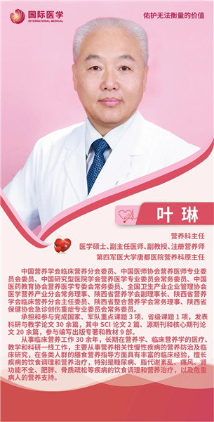 第四軍醫(yī)大學(xué)碩士畢業(yè)后,葉琳進入唐都醫(yī)院營養(yǎng)科工作,憑借豐富的臨床經(jīng)歷和積累的營養(yǎng)指導(dǎo)經(jīng)驗,一步一個腳印,從普通醫(yī)生做到科主任,一干就是近二十年。葉琳在疾病的飲食調(diào)理和營養(yǎng)治療方面經(jīng)驗豐富,尤其擅長糖尿病、脂代謝紊亂、痛風(fēng)、腎功能不全、肥胖、骨質(zhì)疏松等疾病的飲食調(diào)理和危重病人的營養(yǎng)支持。