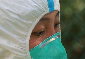 防護(hù)服涔涔的汗水,